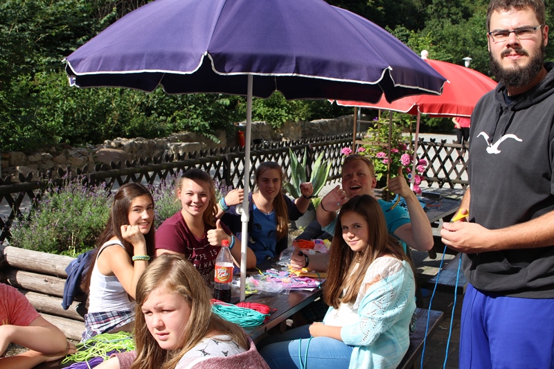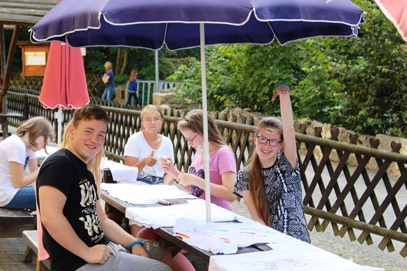 Am Nachmittag schloss sich dann eine Kreativeinheit an. Die Konfirmandinnen und Konfirmanden knüpften Armbänder aus Fallschirmschnüren (Parachords), gestalteten Frühstücksbrettchen mit Brandeisen in Fischform und bemalten T-Shirts.