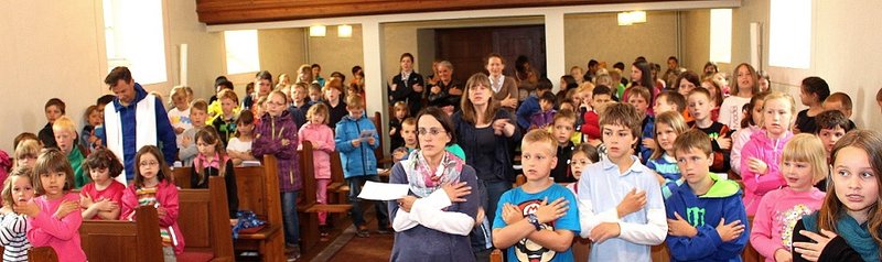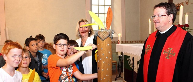 In einem kurzen Theaterstück spielten die beiden Frauen als Jünger Jesu verkleidet zunächst die biblische Pfingstgeschichte nach: Gott schickt den Jüngern den Heiligen Geist, damit sie neuen Mut bekommen. Anschließend waren die Kinder gefordert. Jede und jeder bekam eine Flamme aus Papier und war aufgefordert aufzuschreiben, wofür sie „Feuer und Flamme" sind. Die Flammen wurden in eine große Fackel gesteckt. Nach dem Gottesdienst fand sie ihren Weg in die Schule. Zum Abschluss des Gottesdienstes sprachen einige Kinder ein selbst geschriebenes Fürbittengebet und Pfarrer Sebastian Maurer, der auch schon die Begrüßung übernommen hatte, schloss mit Vaterunser und Segen – natürlich mit Bewegungen zum Mitmachen.