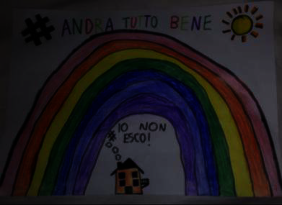 Die Kinder in Italien malen Regenbogen wie auf dem Bild oben und hängen die Bilder in die Fenster, damit alle anderen Kinder, wenn sie vorbei gehen oder fahren, sehen, dass da auch ein Kind wohnt. „Io non esco!“ heißt übersetzt „Ich gehe nicht raus!“ Der Regenbogen und die Sonne sollen auch Mut machen: „Andra tutto bene“ heißt übersetzt „Alles wird gut werden.“